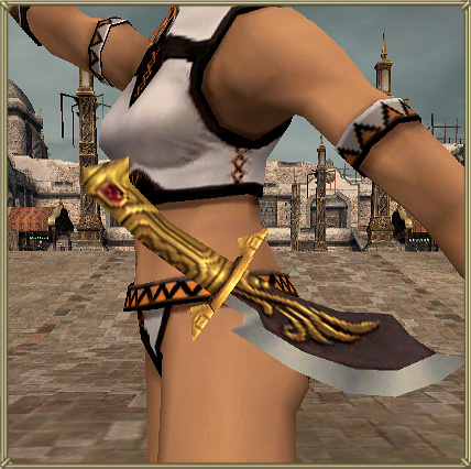 高価なマーリドの牙を磨いて作られた柄に、シンチレーターや宝石が見事に象嵌された、近東風の豪華な短剣。剣身に施された翼の意匠は一種の呪紋で、単なる鋼の刃にそれ以上の切れ味を与えている。