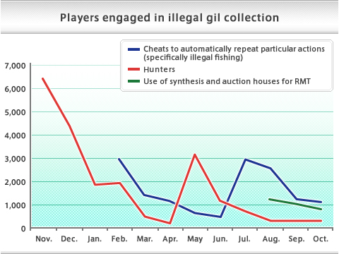 The number of characters engaged in illegal gil collecting, such as hunters (*1) and characters involved in the use of cheats to automatically repeat particular actions, has been significantly reduced as a result of our activities, but we have recently discovered a new kind of illegal activity that uses third-party programs against NPCs in Southern San d'Oria and The Pit. As was mentioned in the previous report, characters involved with large-scale gil collecting for the purpose of RMT (*2) are having a lot of trouble. It can be presumed that characters involved in direct illegal actions through the above method have appeared as a side effect.