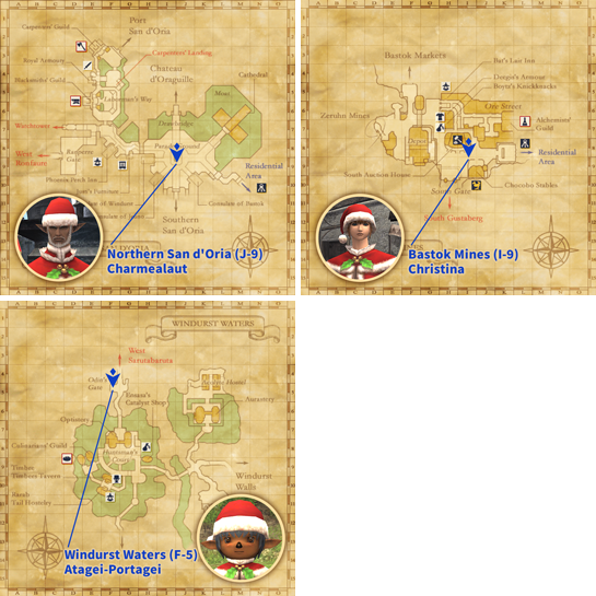 Present any gift tokens obtained during the Starlight Celebration to a festival moogle posted at one of the locations below, and you will receive seasonal items in exchange.