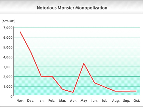 At the time the Special Task Force was established, any mention of hunters would bring up images of people monopolizing Notorious Monsters and causing trouble for regular players. At that time, we set a goal of exterminating these hunters and worked hard at it for a year, finally managing to reach 90% extermination this past summer. However, this is not the end of our activities. As was explained earlier, there are still hunters engaged in other activities. Since we have been able to deal with these kinds of hunters so exhaustively by the end of this year, we would like to exterminate all of the remaining hunters by summer next year.