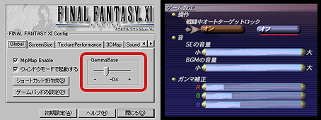 その際は、FINAL FANTASY XI ConfigのGlobalタブの「GammaBase」もしくはゲーム内のメインメニュー「コンフィグ」から「ゲーム設定」を選択し、調整を行ってください。なお、ご使用のディスプレイ、グラフィックカードなどによって、適切な値は異なります。